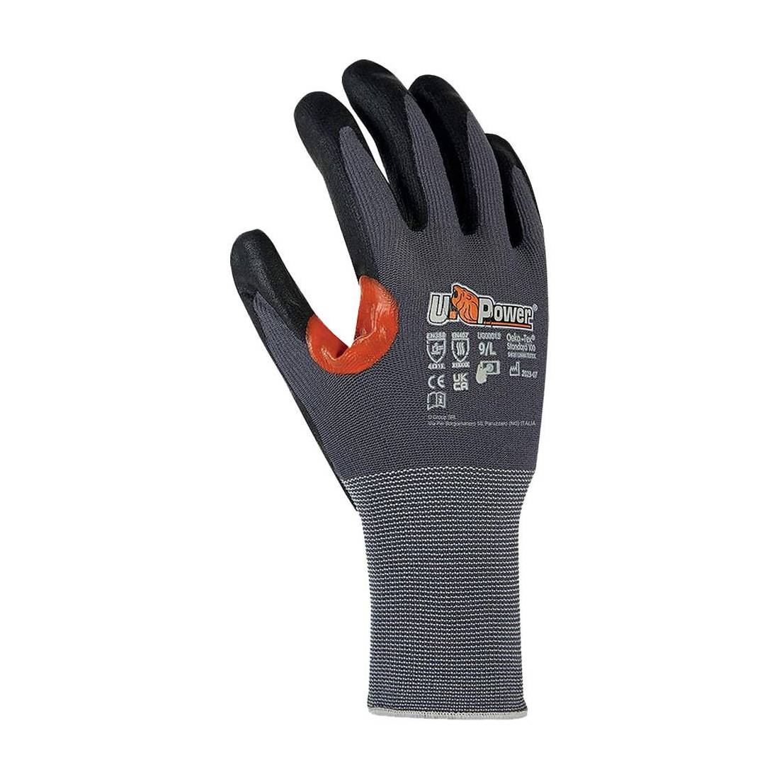 Fodera nylon e spandex grigio, rivestimento nitrile flat. Colore grigio/arancio. Protezione contro i rischi meccanici e termici. Finitura a 15 aghi che consente alte prestazioni di presa con sensibilita' tattile. Resistenza all' abrasione +8.500 cicli superiore alla norma. Rinforzo tra pollice e indice per una durata maggiore. Adatti per logistica, edilizia, agricoltura, service e industria, pesca, automotive. Polsino confortevole in nylon elasticizzato. Touchscreen compatibile per l' utilizzo di smartphone e tablet. A norma EN 407:2020, EN388 4X31X.