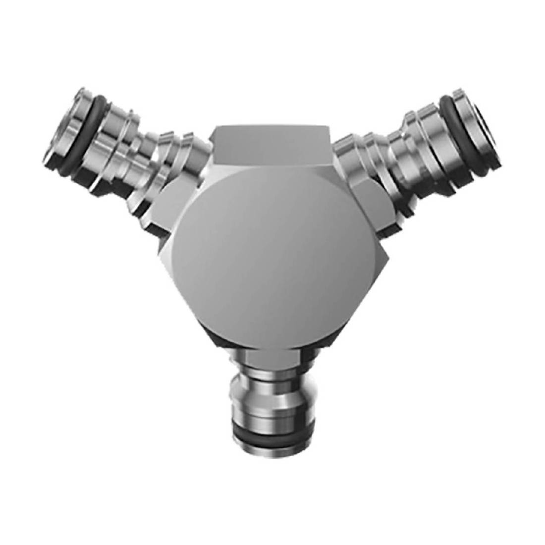In ottone cromato. Per sdoppiare la linea di irrigazione e portare l'acqua in due punti diversi. Si collegano spezzoni di tubo con raccordi automatici alle estremità.