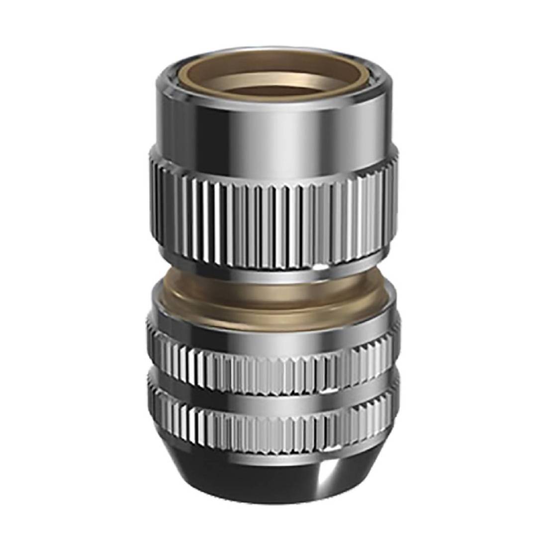 In ottone cromato. Provvisto di 6 sfere interne per assicurare un innesto automatico con una tenuta perfetta. Con stringitubo.