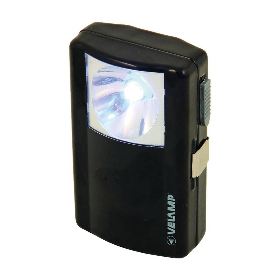 Corpo in metallo, luce frontale a LED. Alta luminosità, 40 lumen, 40 ore di autonomia, con gancio metallico. Batterie non incluse. Dimensioni mm. 67x110x27. Led 1x0,5W.
