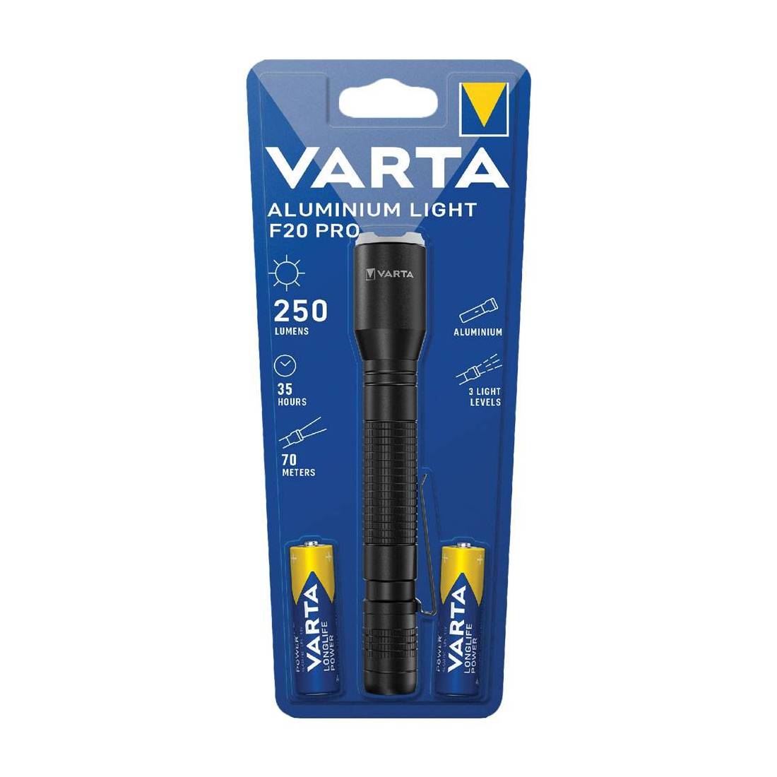 Corpo realizzato in alluminio anodizzato nero. Resistente agli urti, funziona con 2 batterie tipo AA 1,5V incluse. Illuminazione fino a 70 metri. A tre livelli di intensita' luminosa, autonomia 35 ore. Adatta per la casa, auto, fai da te, sport. Dimensioni mm 160x25. In blister.