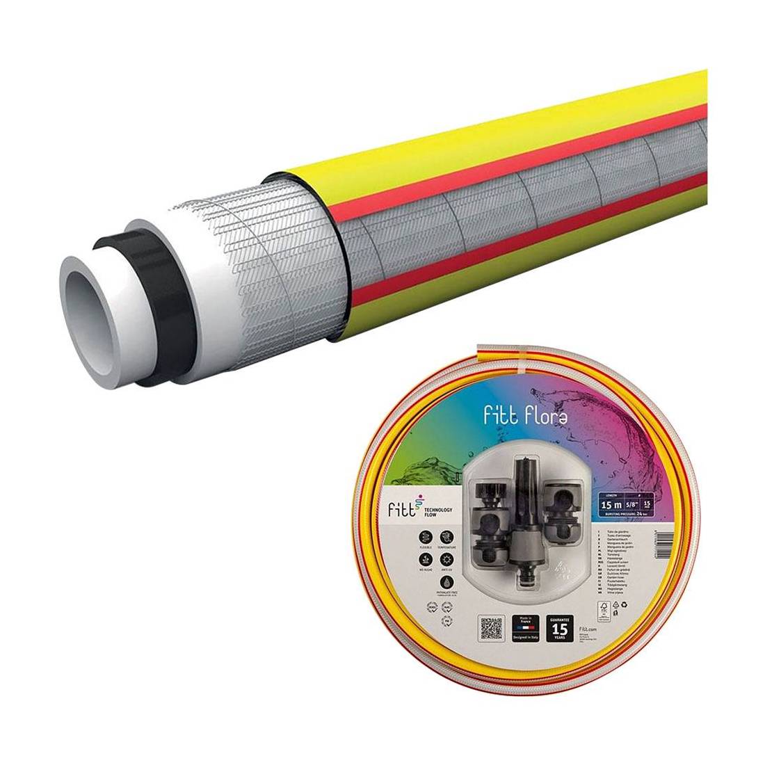Tubo coestruso in 5 strati antitorsione, di altissima qualità costruttiva. Dotato di elevata flessibilità e malleabilità. Rinforzo tessile magliato con spirale, strato intermedio di sostegno bianco, strato nero anti-alga, interno protettivo bianco. Rivestimento esterno giallo con banda trasparente e due righe rosse. Indicato per uso intensivo nel giardinaggio. Completo di set raccordi e lancia, con presa rubinetto 3/4'.