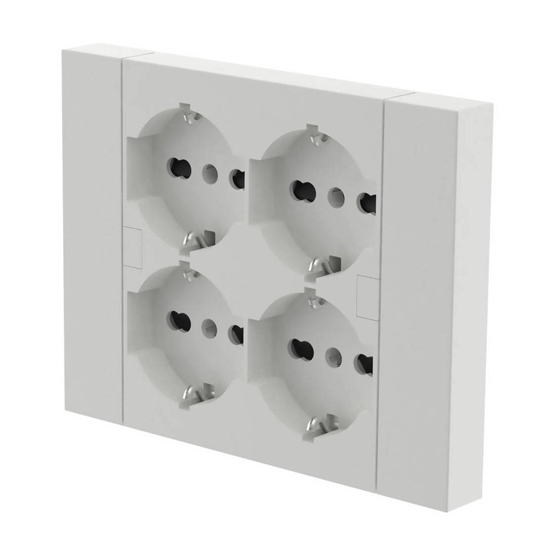 Adatta per scatola a 3 posti sia per muratura che per cartongesso. Ideale per cucine, uffici, camere da letto, corrodoi. Con 4 biprese: 2x2P+T10/16A + 2P+T Schuko. Ingombro ridotto, cablaggio rapido. Protezione IP20, 250V - 16A. Dimensioni: cm 13,4x10,2x3,7 cm. Design registrato e brevettato. Certificazione TUV-SUD MARK, CE.