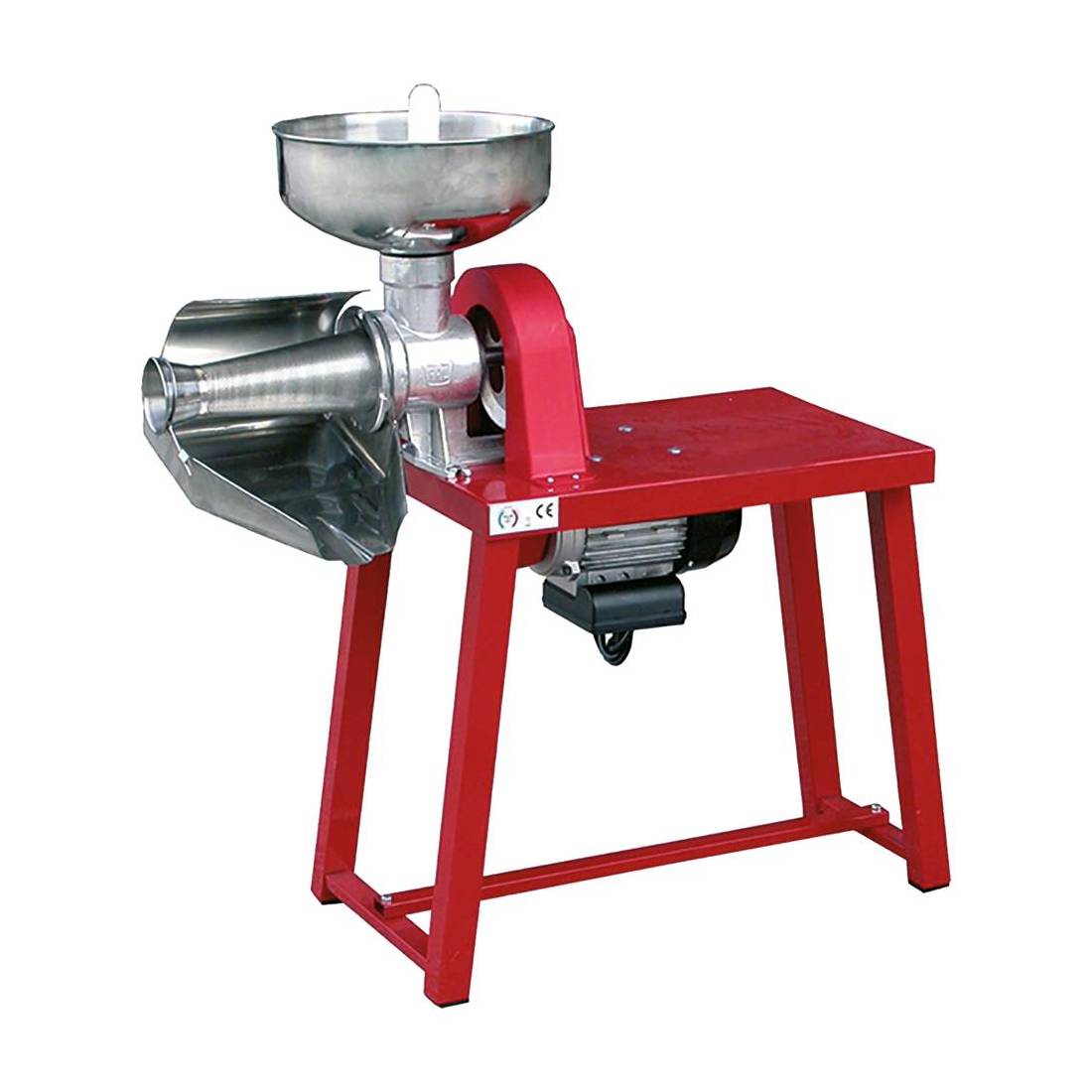 Macchina per la trasformazione del pomodoro. Corpo macchina e ghiera in alluminio UNI 50 pressofuso brillantato per alimenti. Trasportatore a vite in PA. Albero in acciaio. Trasmissione con puleggia a cinghia trapezioidale. Filtro, gocciolatoio, imbuto in acciaio inox. Pestello in polietilene. Tavolo da lavoro in acciaio verniciato. Protezione IP54.