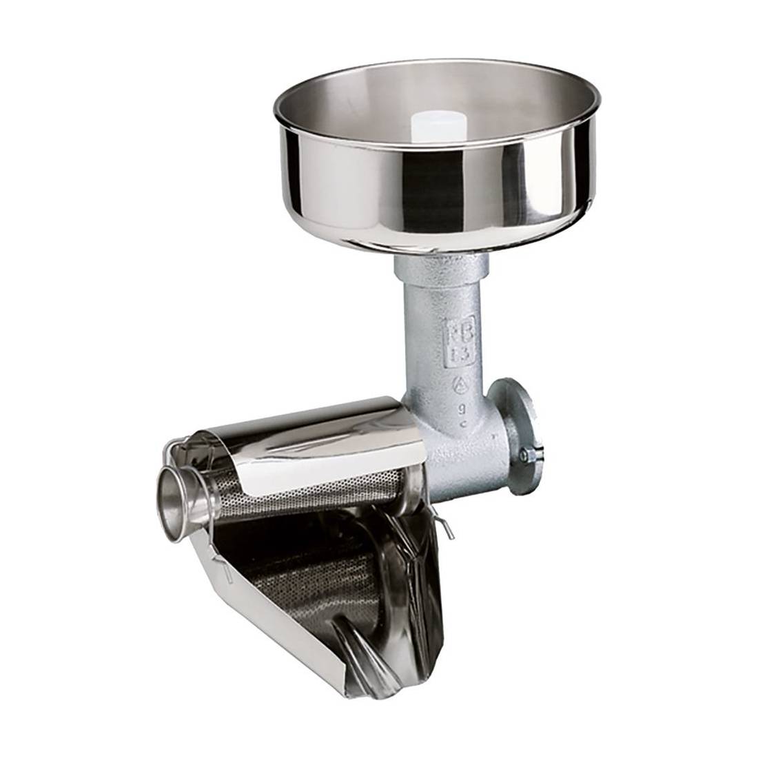 Con corpo ed elica in nylon. Trattata con resina alimentare. Completo di imbuto, paraspruzzi, scivolo e filtro in acciaio inox, pestello in plastica.