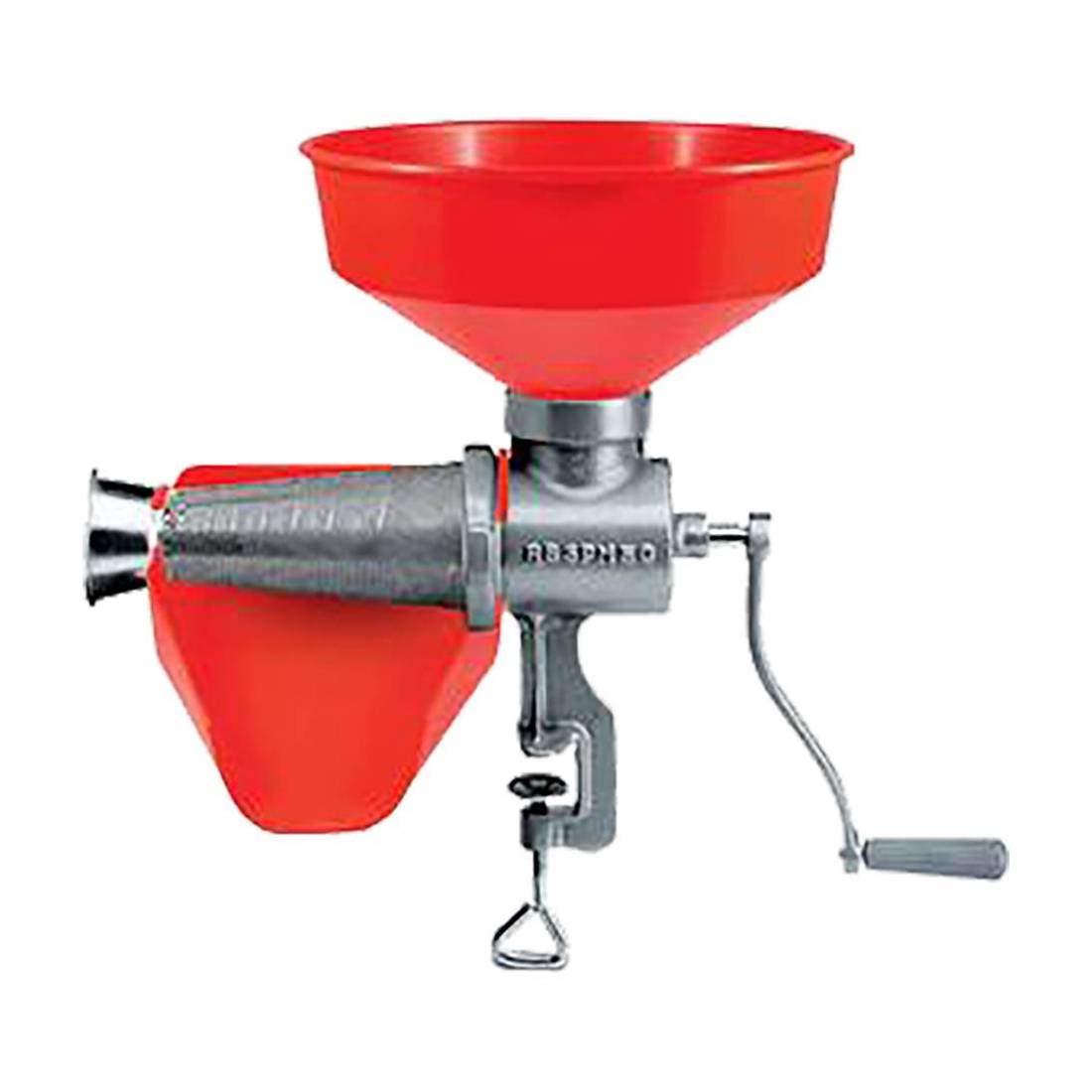 Elica di spremitura in resina acetalica, certificata per il contatto con gli alimenti. Cono filtro in acciaio INOX AISI 304. Imbuto e sgocciolatoio in materiale plastico per alimenti. Perno di traino in acciaio e nylon. Corpo in ghisa trattata per uso alimentare con polveri epossidiche cotte in forno a 300°C.