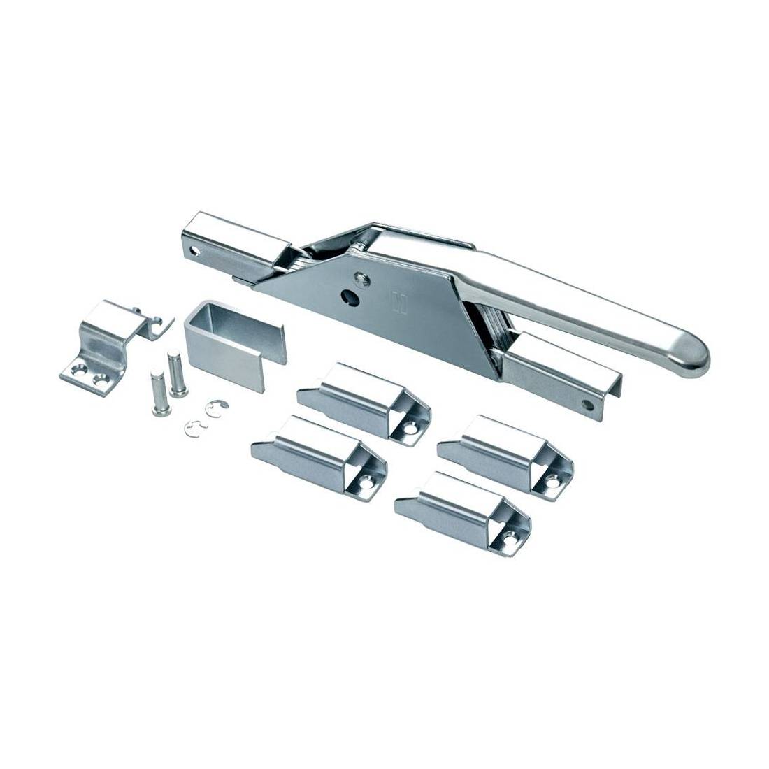 Per serramenti in ferro o legno, con foro per lucchetto. Completo di accessori. Finitura zincata.