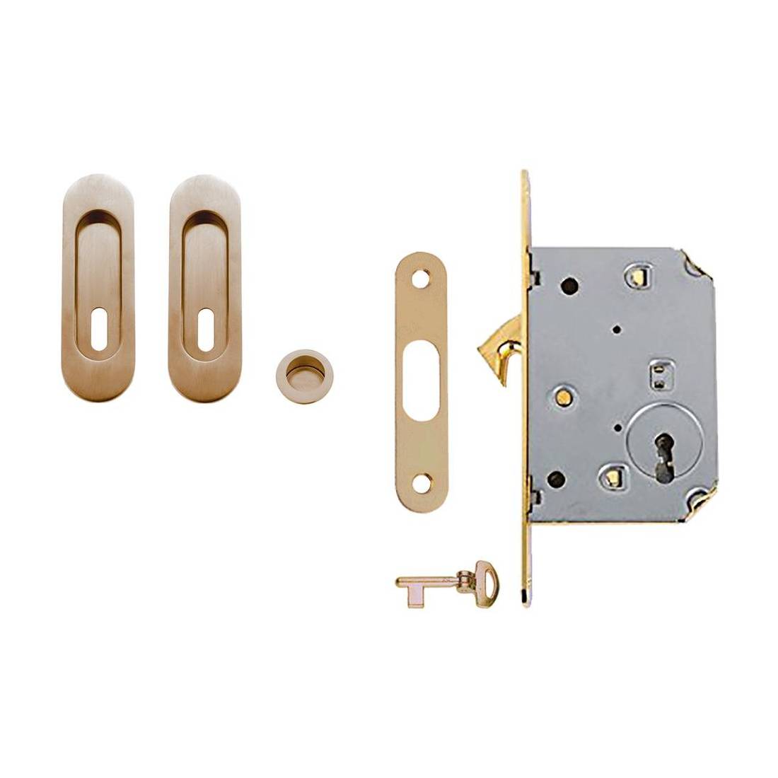 Composizione: coppia nicchie ovali mm 30x85 con foro chiave basso, nottolino Ø 25 mm, serratura solo chiave entrata 50 mm, chiave snodata.