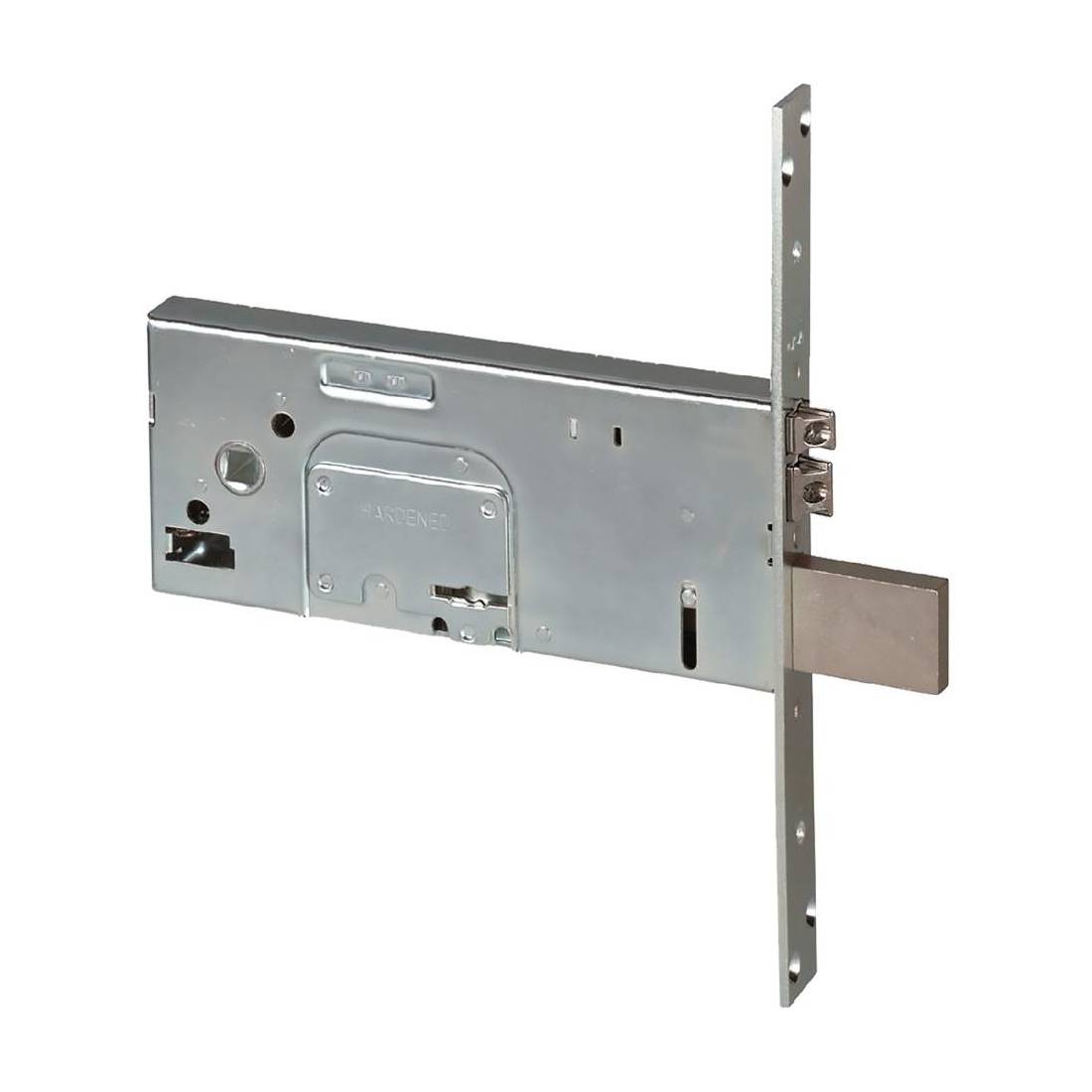 Scatola e frontale con rivestimento in zinco, catenaccio in acciaio. Scrocco regolabile nichelato autobloccante, tensione 12V. Altezza scatola 78 mm, 4 mandate, frontale 25 mm, interasse 67 mm, 2 chiavi.
