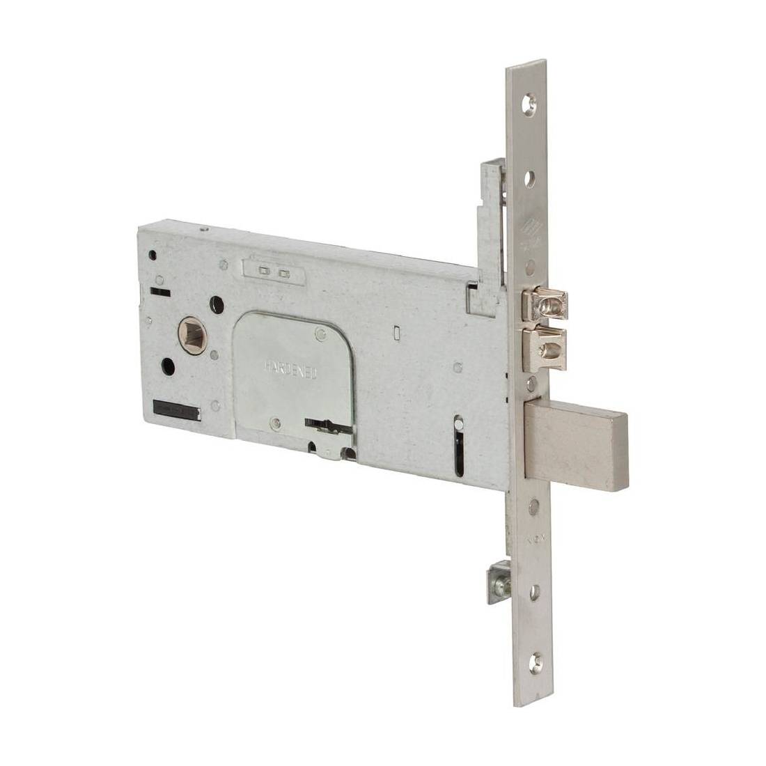 Triplice. Scatola e frontale con rivestimento in zinco, catenaccio in acciaio. Scrocco regolabile nichelato autobloccante, tensione 12V. Altezza scatola 78 mm, 4 mandate, frontale 25 mm, interasse 67 mm, 2 chiavi.