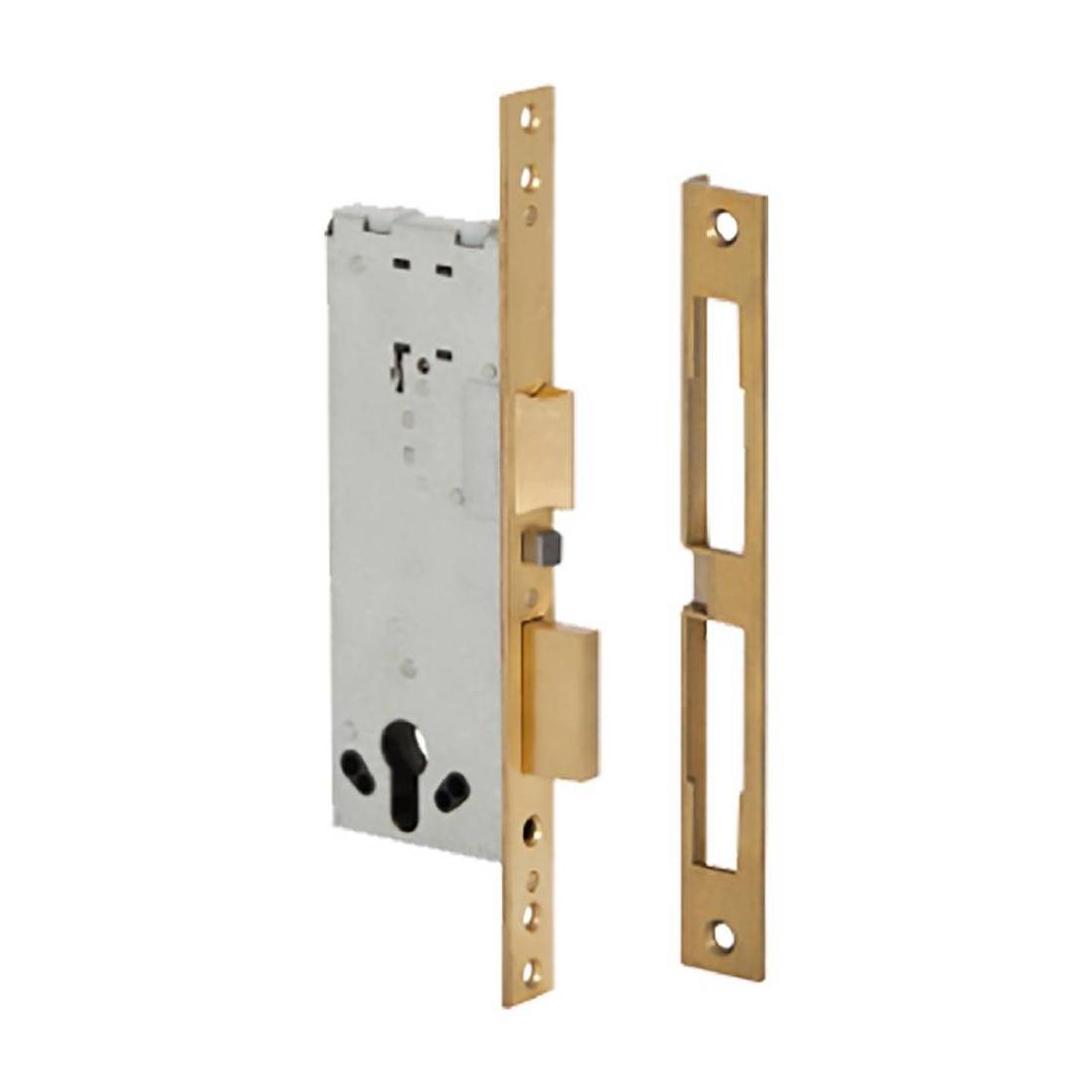 Scrocco e catenaccio con ritorno automatico, scatola in acciaio, frontale e contropiastra in ottone satinato. Scorcco reversibile elettrificato, tensione 12V, 2 mandate, frontale 22 mm. Dotazione: contatti elettrici, contropiastra, viti fissaggio. Senza cilindro.