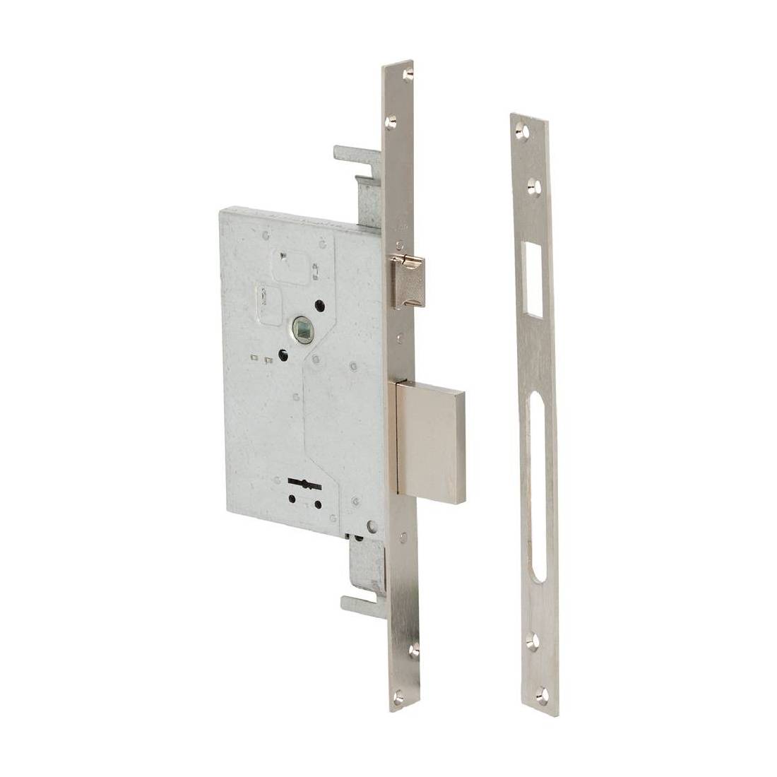Triplice. Catenaccio e scrocco, frontale e contropiastra in acciaio satinato, scatola acciaio. Scrocco revesibile nichelato, catenaccio 4 mandate. Frontale 22 mm, interasse 85 mm. Dotazione: contropiastra, viti, tre chiavi.