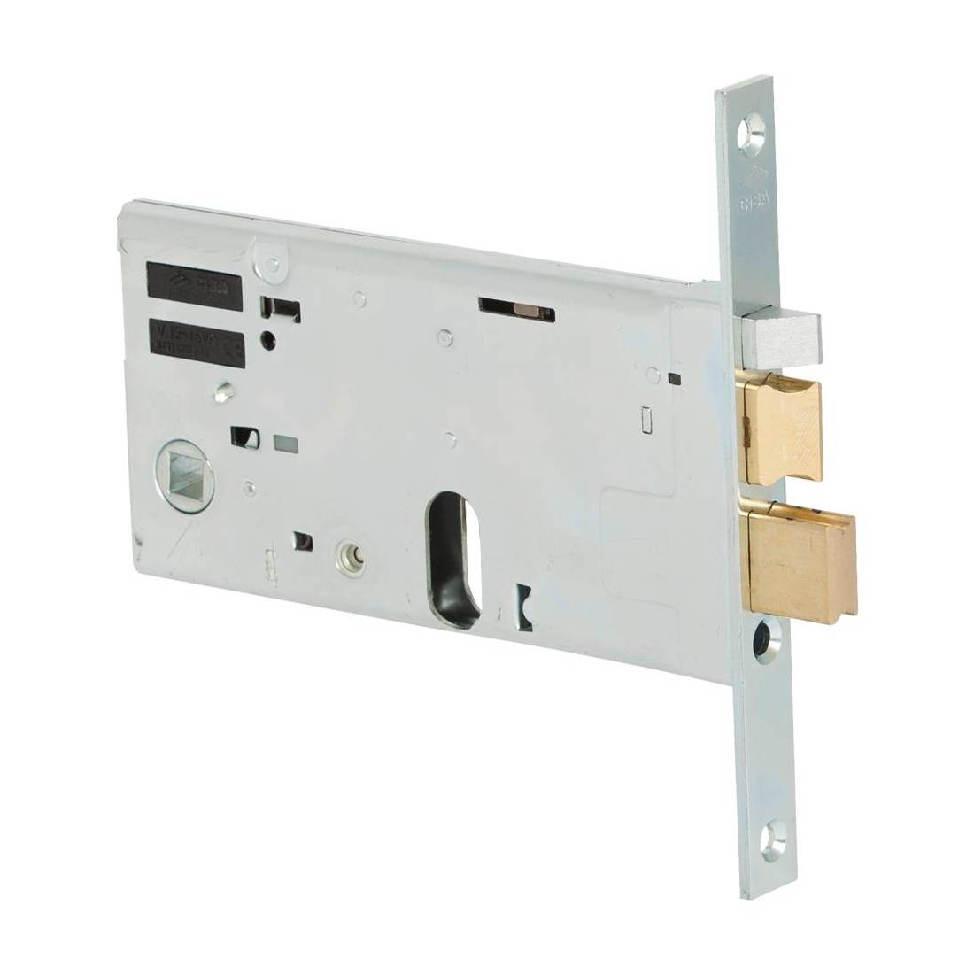 Foro cilindro europeo ovale. Con scroccp autobloccante. Scatola e frontale zincato. Scrocco in ottone, altezza scatola 77 mm. Tensione 12V, quadro maniglia mm 8. Dotazione vite di fissaggio cilindro. Senza cilindro.