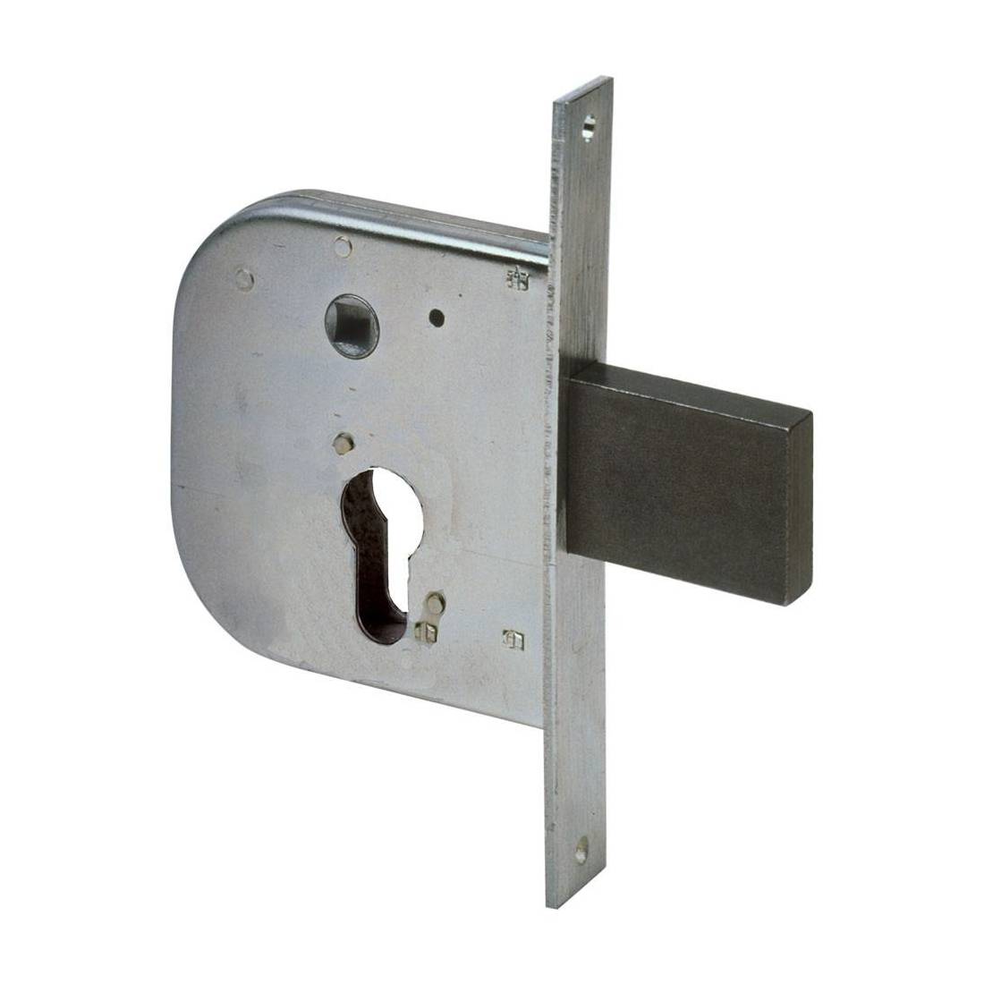 Con scrocco e catenaccio incorporato. Quadro maniglia passante. Scatola in acciaio con rivestimento in zinco. Foro cilindro europeo, catenaccio in acciaio. Frontale in acciaio con rivestimento in zinco da 22 mm. Interasse 42 mm. Senza cilindro.