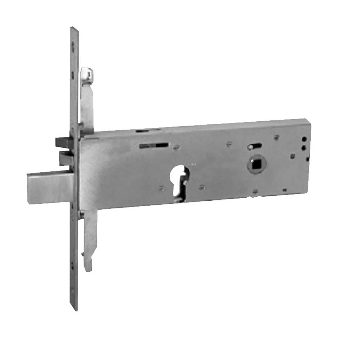 Foro cilindro profilo europeo. Chiusura triplice, tre mandate, scrocco e pistone di carica separato reversibile e regolabile. Agganci aste a vite. Dotata di doppia ghiera, grano interno per fissaggio cilindro, viti di fissaggio, coppia spessori sottofrontale, tre chiavi. Frontale inox. Alimentazione 12V.