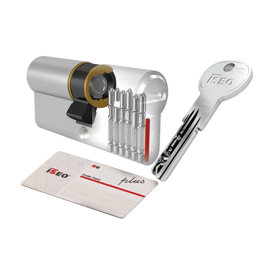 Profilo europeo, finitura nichelata opaca. Sistema di cifratura a 6 pistoncini in acciaio inox. Resistenza alla manipolazione grazie ai controperni in ottone sagomati a fungo. Resistenza al trapano grazie agli inserti posizionati su entrambi i lati del corpo cilindro e allo strappo. Chiave reversibile in ottone nichelato, numerazione a codice sul collo chiave. Dotazione 5 chiavi padronali, 1 chiave cantiere e Code Card per duplicazione.