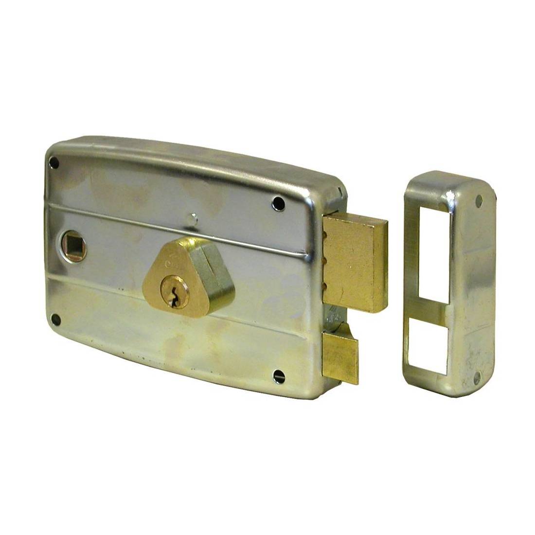 Cilindro esterno fisso. Catenaccio e scrocco separato in ottone, quadro maniglia passante mm 8. Scatola in acciaio con rivestimento in zinco. A 2 mandate. Dotata di bocchetta in acciaio zincato, viti fissaggio e 3 chiavi.