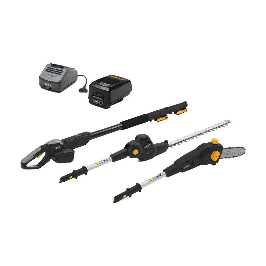 Completo di barra per potatura da 20 cm a sistema di lubrificazione automatico della catena, tagliasiepi doppio taglio da 45 cm, distanza denti (18 mm), asta telescopica per altezza massima raggiungibile 4 mt (operatore+attezzo). Motore con spazzole (potenza 150W funzione tagliasiepi - 280W funzione potatore), velocità 2600 rpm, Ø tubo albero 26 mm. Larghezza taglio 415 mm, tipo catena 3/8'.050' (91PJ033X), velocità catena 5 m/s, tensionamento laterale. Pressione sonora 75.3 dB. Con impugnatura posteriore, bretella, asta prolunga 55 cm, batteria, caricabatteria. Peso macchina 4,6 kg.