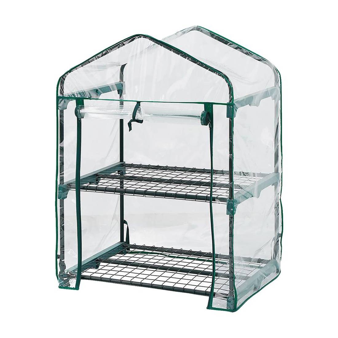 Con 2 ripiani. Struttura in metallo verniciato con polveri epossidiche antiruggine. Indicata per coltivazioni di piante, fiori, frutti, ortaggi. Completa di telo di copertura in polietilene trasparente con filtro UV con chiusura a cerniera. Apertura anteriore 49x71 cm. Senza ruote.
