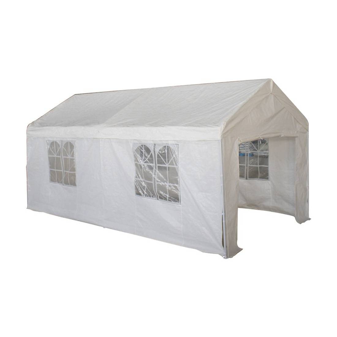 Telaio in metallo. Telo di copertura in poliestere 160 gr./mq, tubi Ø 38 mm. Altezza massima al centro 3 mt. Colore bianco.