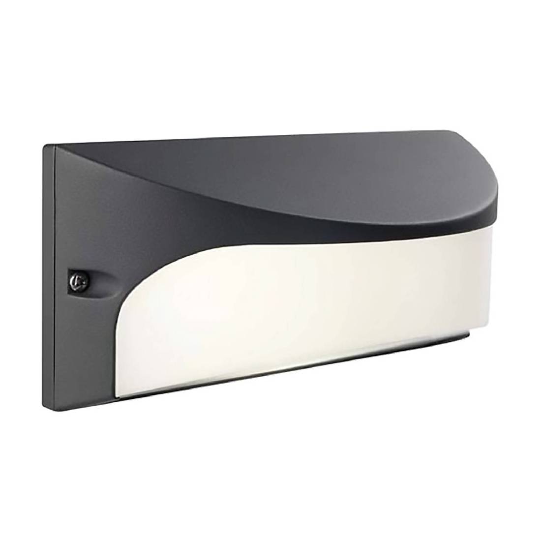A modulo led sostituibile. Per esterno, struttura in alluminio pressofuso e diffusore in resina satinata, IP54, 700 lumen 4000K. Dimensioni: cm 22x9,8x10. Prodotto 'Made in Italy'.