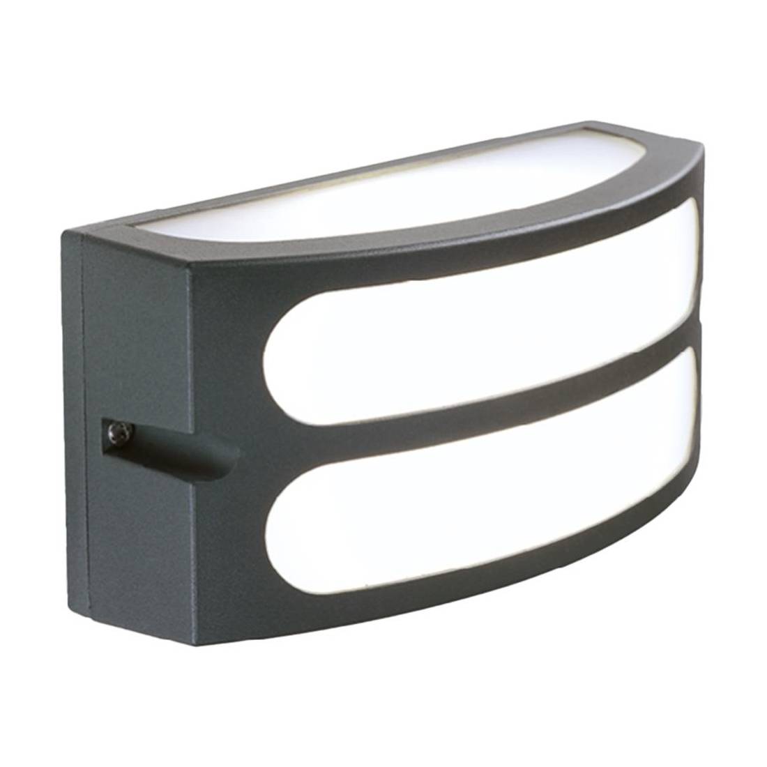 Struttura in pressofusione di alluminio. Diffusore in resina satinata. Per lampade ad incandescenza e a risparmio energetico. Dimensioni cm. 22x8,5x10, 60W. Attacco E27, IP54.