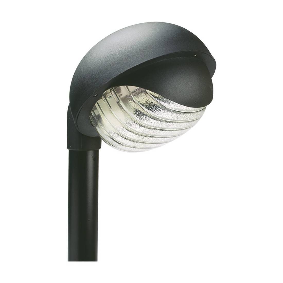 Tipo tondo. Struttura in termoplastico, diffusore in vetro stampato. Adatta per lampade ad incandescenza e a risparmio energetico. Attacco E27, IP44. Attacco a colonna da Ø 60 mm. Solo corpo lanterna, palo optional.