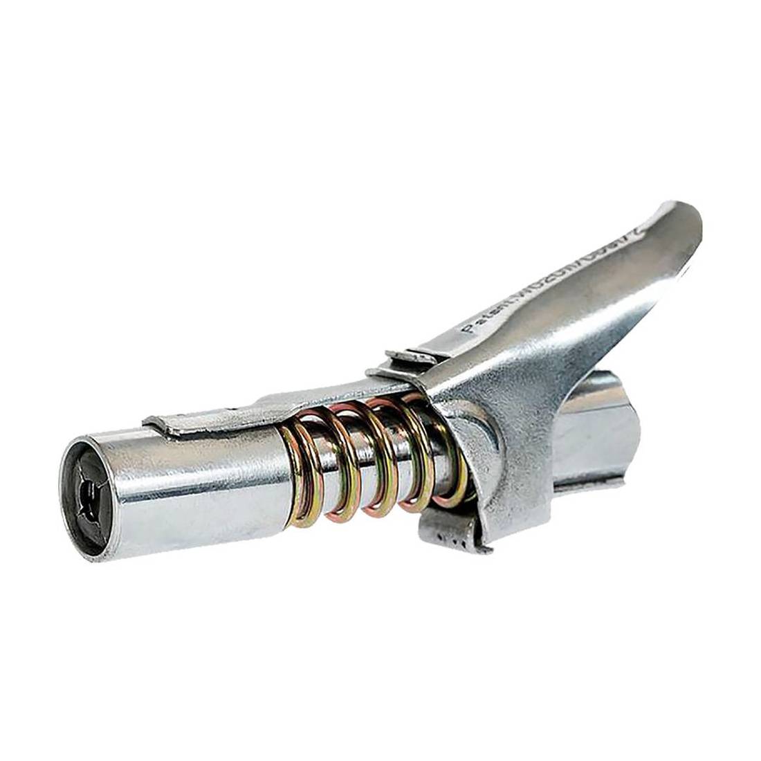 In acciaio zincato. A 4 ganasce in acciaio temprato, adatta a tutti gli ingrassatori secondo le specifiche DIN. Il nipplo lubrificante viene rilasciato semplicemente premendo il grilletto. Con attacco rapido.