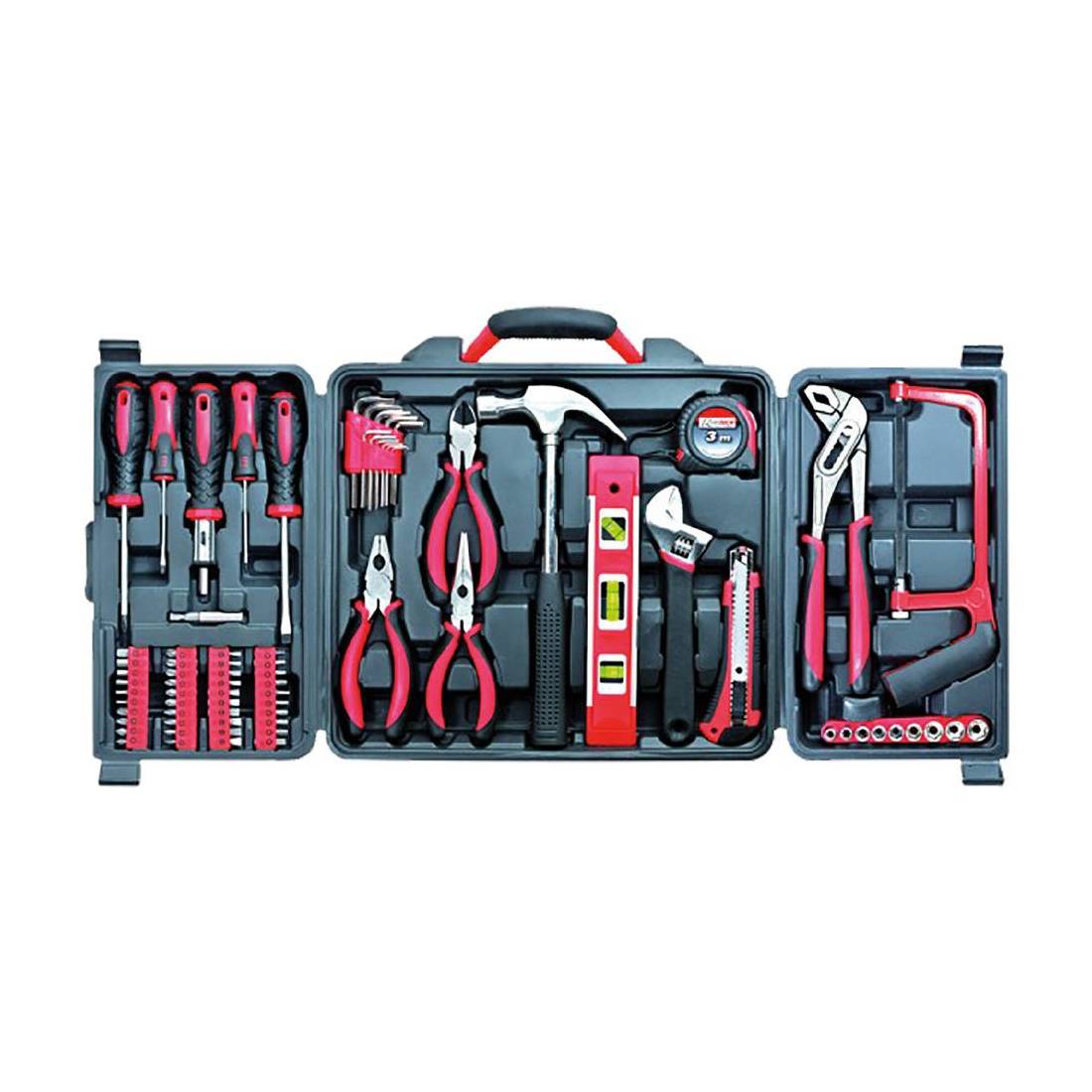 In valigetta plastica con impugnatura soft. Composizione: 4 cacciaviti cromo vanadio: 3x75mm, 6x100mm, PH0x75mm, PH2x100mm, 1 cacciavite a cricchetto reversibile 1/2, 1 porta inserti magnetico, 40 inserti 25 mm: 3,4,5,6,7, 11 chiavi 6 sezioni: 1.27,1.5,2,2.5,3,3.5,4,4.5,5,5.5,6, 1 pinza universale 150mm, 1 pinza becchi lunghi 150mm, 1 pinza taglio 150mm, 1 martello carpentiere, 1 livella a bolla 225mm, 1 chiave rullino, 1 cutter lama 18mm, 1 flessometro autobloccante 3mt con gancio, 1 pinza a cerniera, 1 seghetto lama 150mm, 9 bussole 1/4' da 5 a 13mm.