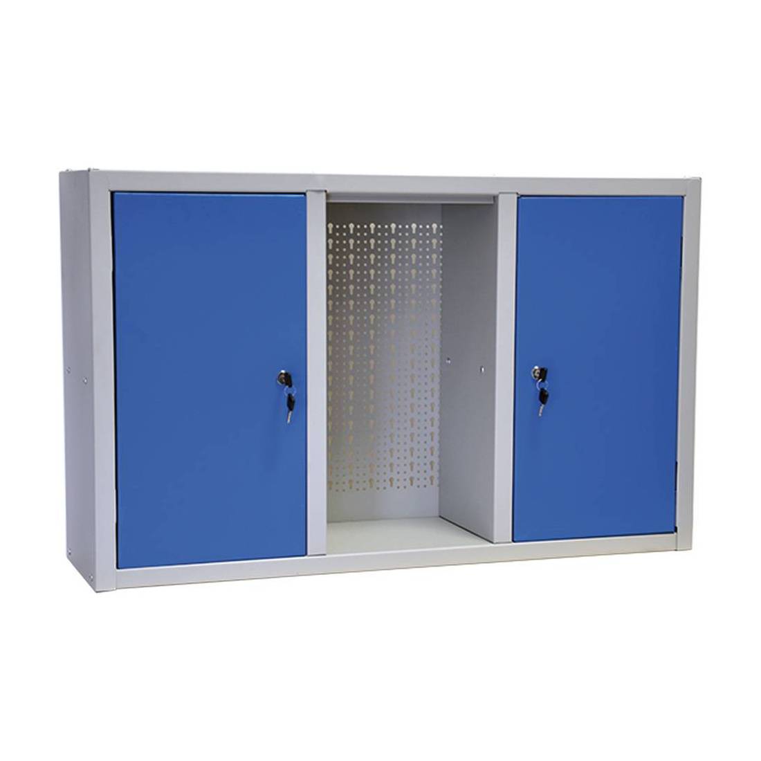 Fornito smontato. In lamiera, 2 ante di colore azzurro. Fondo realizzato con pannello forato per avere la possibilita' di appendere attrezzi ed utensili da lavoro.