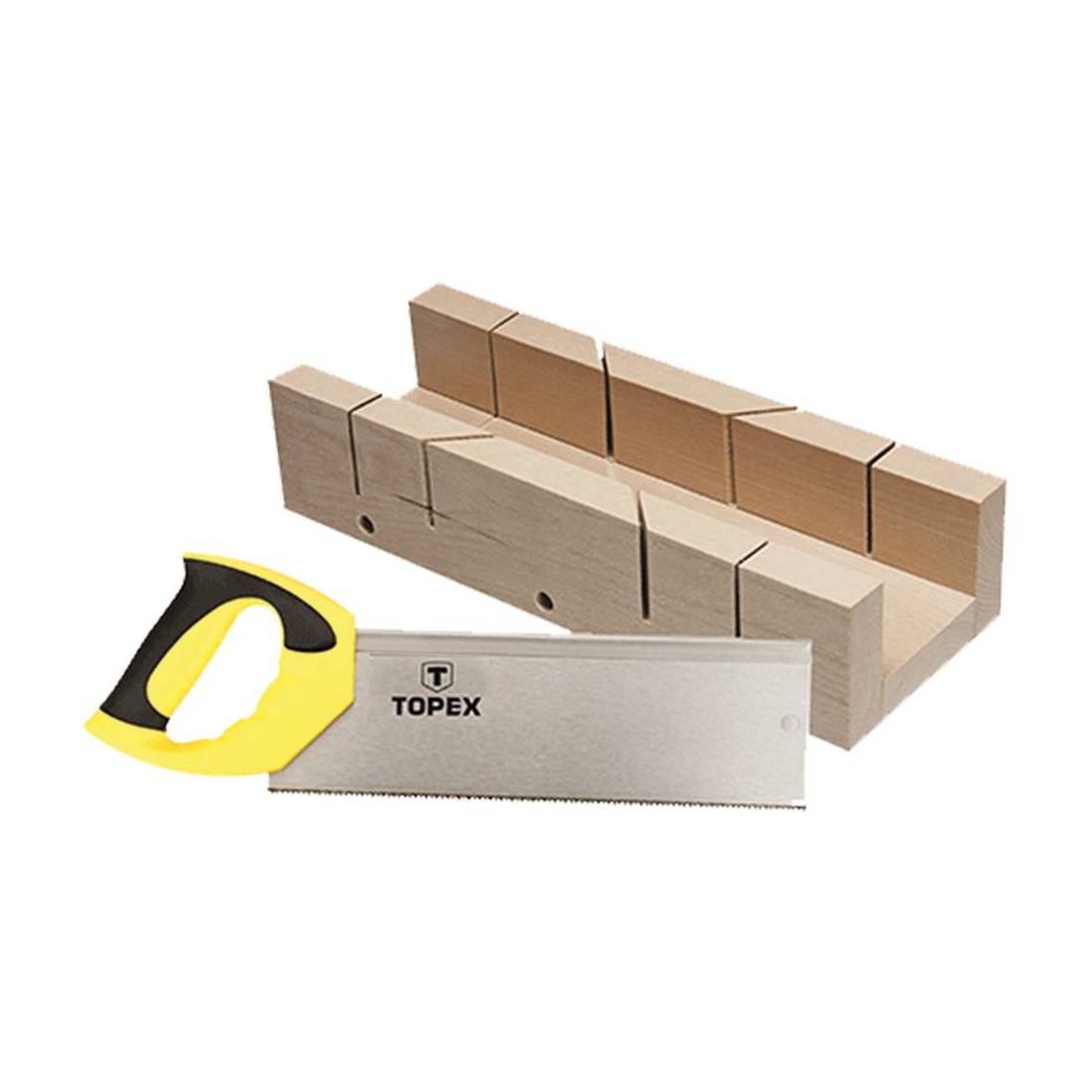 Fornita con sega da mm. 350 a manico ergonomico antiscivolo. Base in legno predisposta per taglio a 45 e 90°.