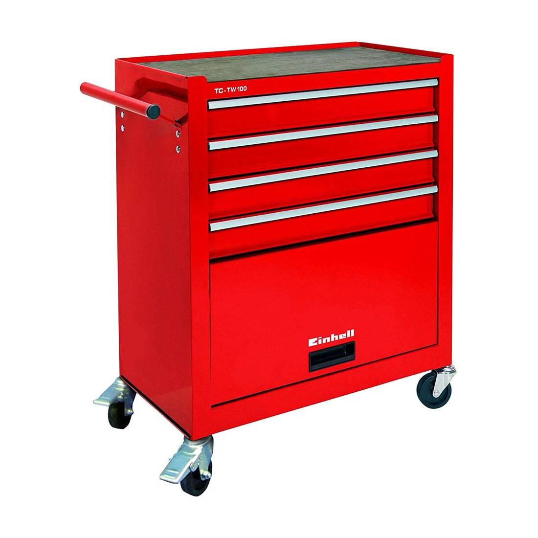 Realizzato con struttura robusta in acciaio vernicato di colore rosso. Progettato per offrire una soluzione pratica e funzionale per l'organizzazione degli attrezzi e degli utensili. Fornito con 4 cassetti a estrazione agevolata e vano porta oggetti inferiore con coperchio. Con quattro ruote robuste e girevoli in plastica (due con freno), impugnatura di spinta. Superficie di appoggio con tappetino. Possibilita' di aprire un solo cassetto alla volta. Dimensione cassetti cm 50x30xh.7. Portata max 75 kg.
