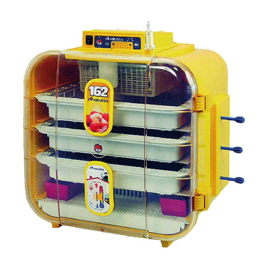 Per pollicoltura e selvaggina. Porta trasparente. Cassettino adatto per tutti i tipi di uova. Dotata di girauova esterno manuale e di due ventilatori posizionati rispettivamente sopra e sotto la sede delle uova. Potenza massima assorbita 240W.