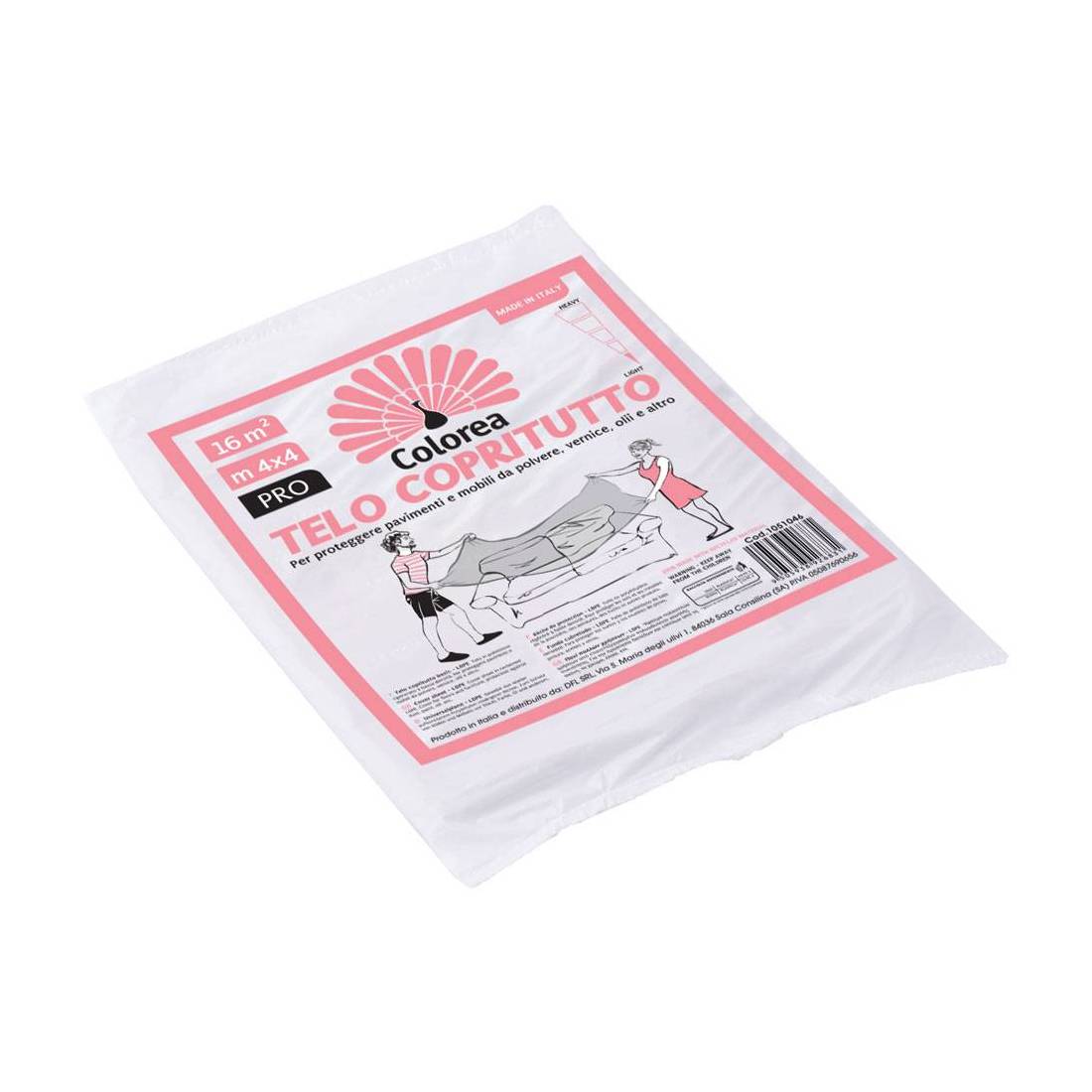 In polietilene neutro, alta densita'. Ideale per proteggere superfici (per una copertura di 16 mt.2) ed oggetti da schizzi, polveri e sporco durante lavori di tinteggiatura. Confezionamento in busta.