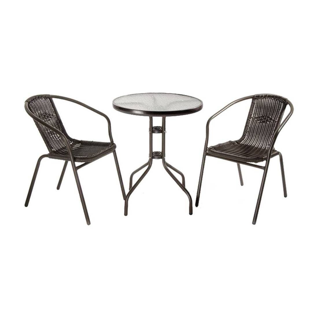 Composto da 2 sedie con braccioli con struttura in tubo di metallo verniciato e seduta/schienale in polyrattan da cm. 53x54h.74 e 1 tavolino tondo da Ø cm. 60xh.70 con piano di vetro temperato da 5 mm. Telaio in metallo.