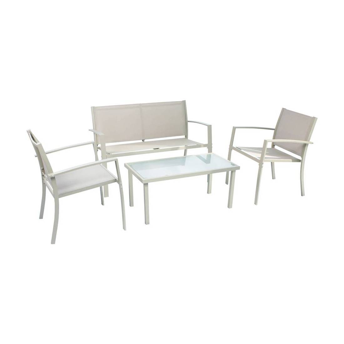 Composto da 2 poltrone con struttura in tubo di acciaio seduta/schienale in textilene da cm. 58x58xh.75 e 1 tavolino rettangolare da cm. 84x44xh.38 con piano di vetro temperato da 5 mm, 1 divanetto 2 posti seduta/schienale in textine da cm. 110x58xh.75, telaio verniciato.