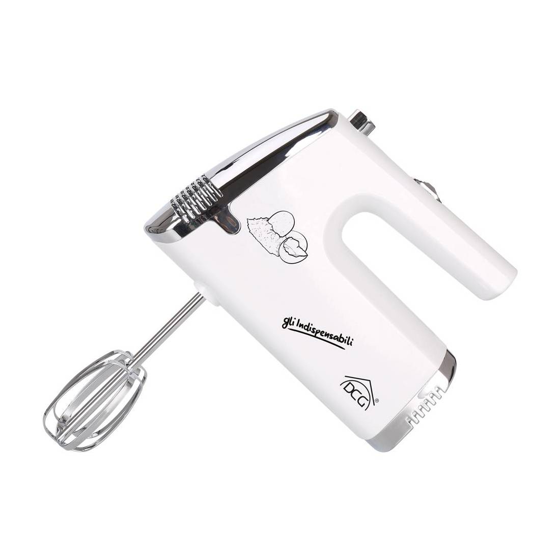 Corpo in plastica. A 5 velocità, 2 fruste e 2 ganci in acciaio, tasto espulsione fruste. Ideale per amalgamare, montare a neve, mescolare. Dotato di parte posteriore piatta per appoggio su tavolo. Tensione 240V - 50Hz. Dimensioni: 18x9x h.19 cm.