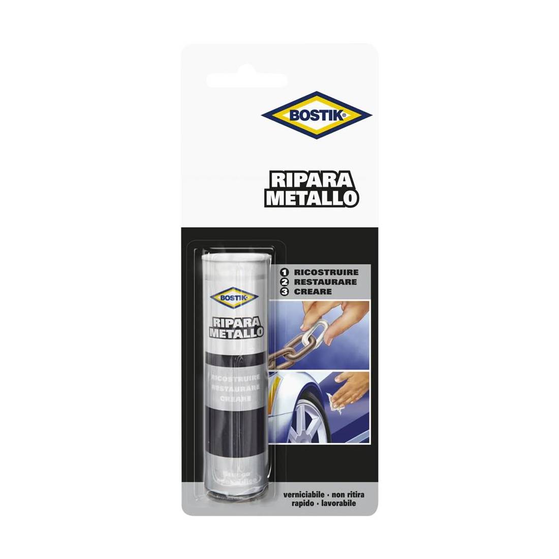 In stick. A base epossidica, indicato per riparare, saldare, ricostruire e stuccare metallo, ferro, alluminio, rame, ottone, bronzo, ghisa, piombo. Adatto anche per plastiche dure, tubi, valvole, serbatoi, parti di motore, batterie, arnesi di metallo, condotti per l'aria, parti di bici, moto ed auto, condotti tubature. Indurisce in pochi minuti. Colore grigio metallo.