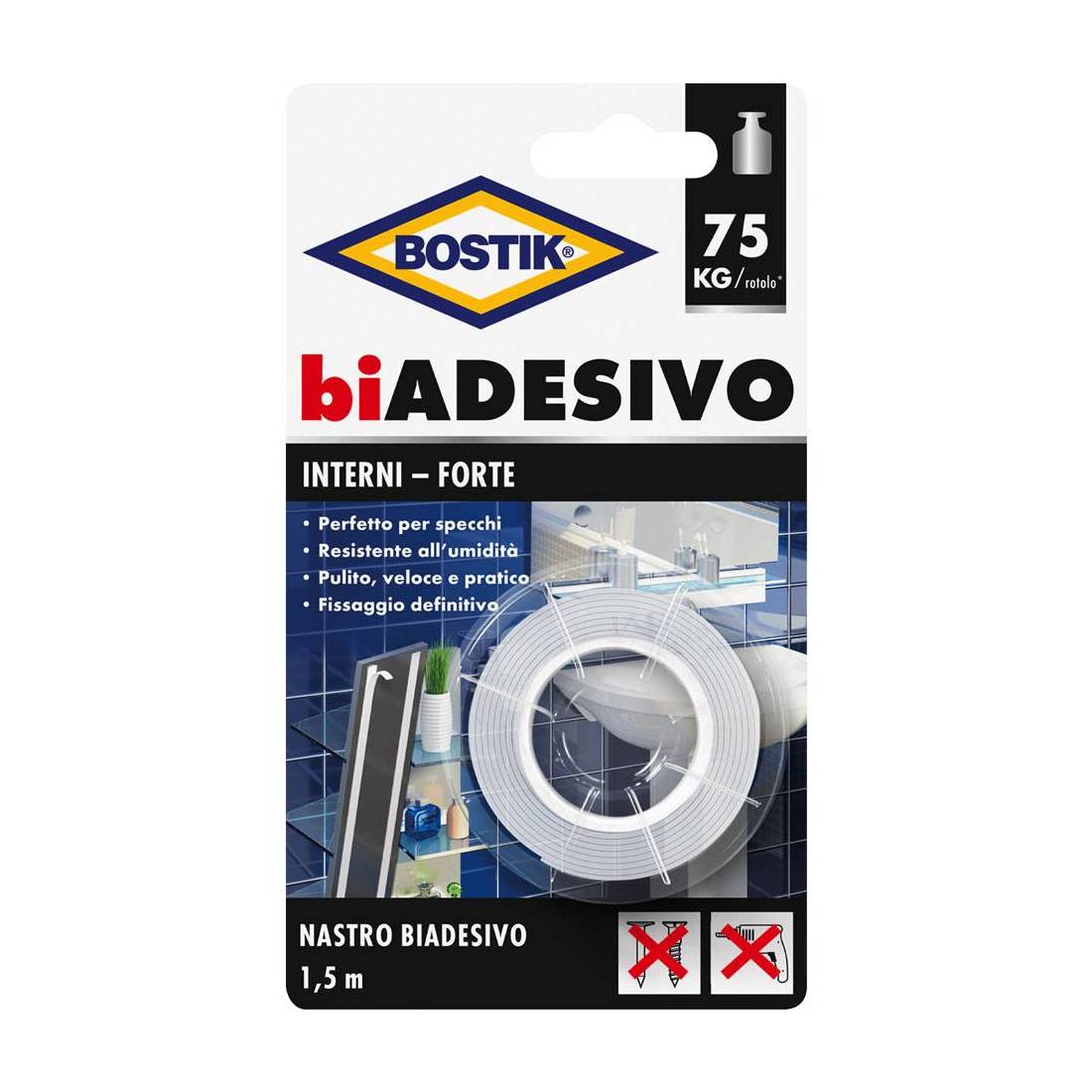 Tipo forte, per montaggio e fissaggio permanente di oggetti in ambienti interni. Alternativa invisibile a viti e chiodi. Tenuta permanente e sicura su quasi tutte le superfici lisce tipo vetro, metallo, piastrelle, plastica, legno verniciato. Adesivo in gomma sintetica, supporto in schiuma di polietilene. Buona resistenza all'umidità, forza finale incollaggio dopo circa 60 minuti circa. Ogni rotolo ha una portata totale di circa 75 kg. In blister.