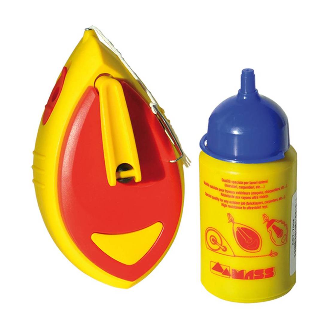 Cassa in materiale plastico antiurto con manovella a meccanismo rapido di avvolgimento. Completo di filo in poliestere da 30 mt e flacone da 120 ml. di polvere blu.