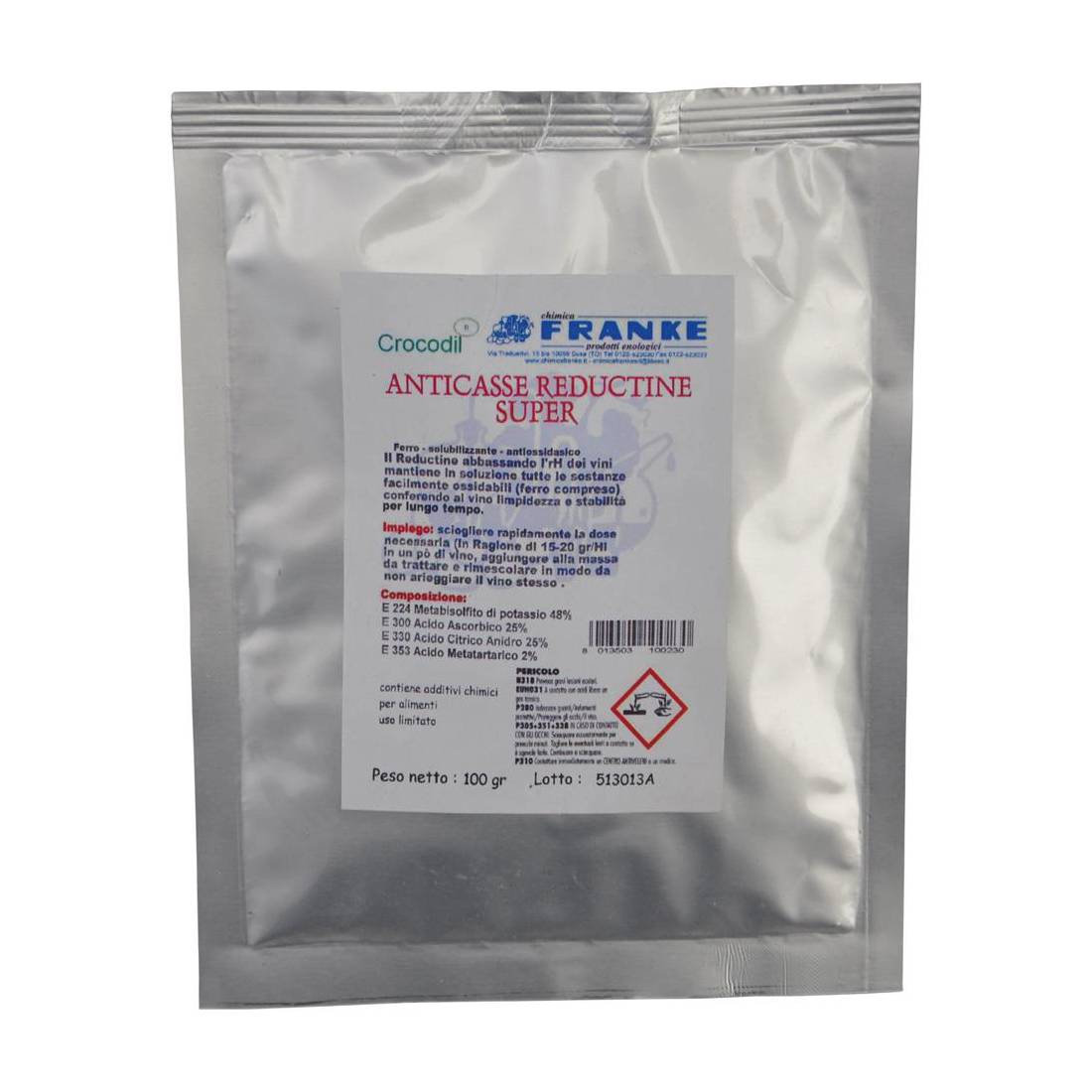Preparato di polvere cristallina bianca, antiossidante e conservante per i vini. Composto da acido citrico anidro, K metabisolfito, acido L - ascorbico. Cura e previene tutte le casse, conferendo al vino limpidezza e stabilita'. Valida alternativa all'uso di ferrocianuro di potassio. Si impiega in ogni tipo di vino, specialmente in quelli di pregio che richiedono conservazioni prolungate. Risulta essere, inoltre, un coadiuvante di conservazione anche in vini a basso grado alcolico e con scarsa acidita'. Dosi d'uso: 15-20 g/hl preventivo per imbottigliamento.