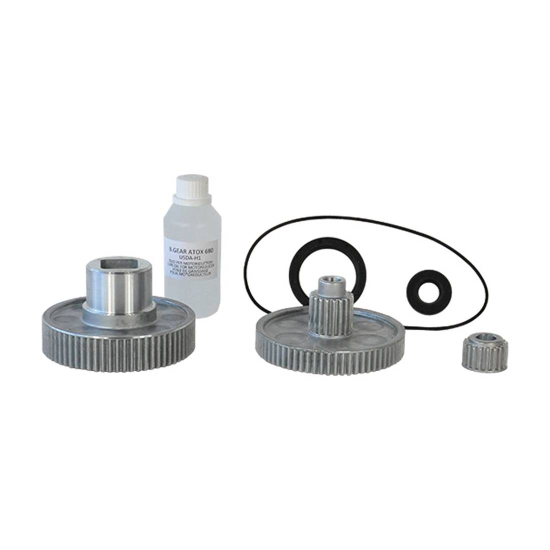 Set composto da 1 flacone di olio, guarnizioni ed ingranaggi. Adatto per motoriduttori Hp 0,40 e Hp 0,80.
