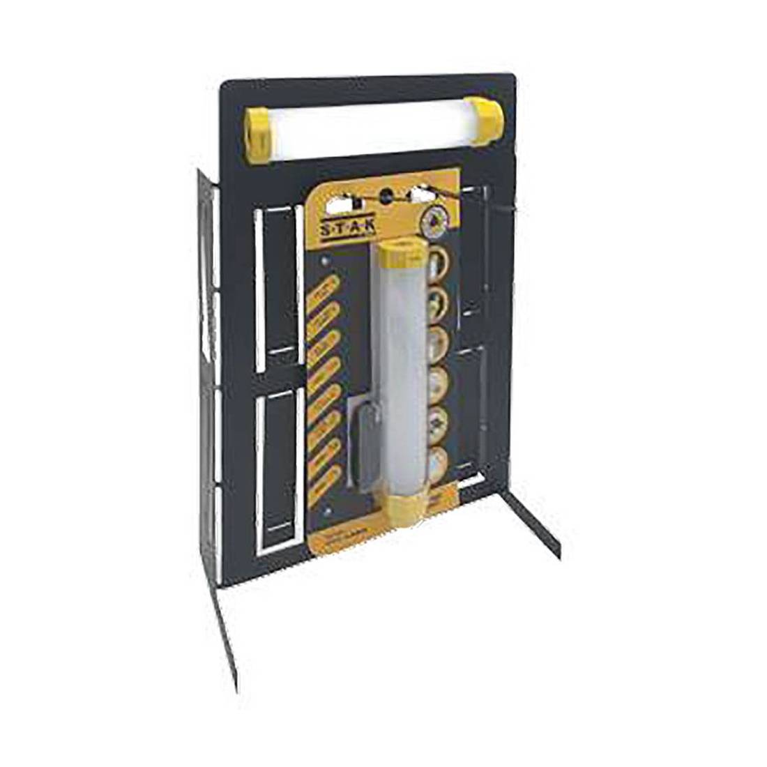In metallo verniciato. Dimensioni: chiuso 47x0,5xh.43 cm, aperto 30x17xh.43 cm. Soluzione espositiva per materiale elettrico blisterato: batterie, torce, lampade.