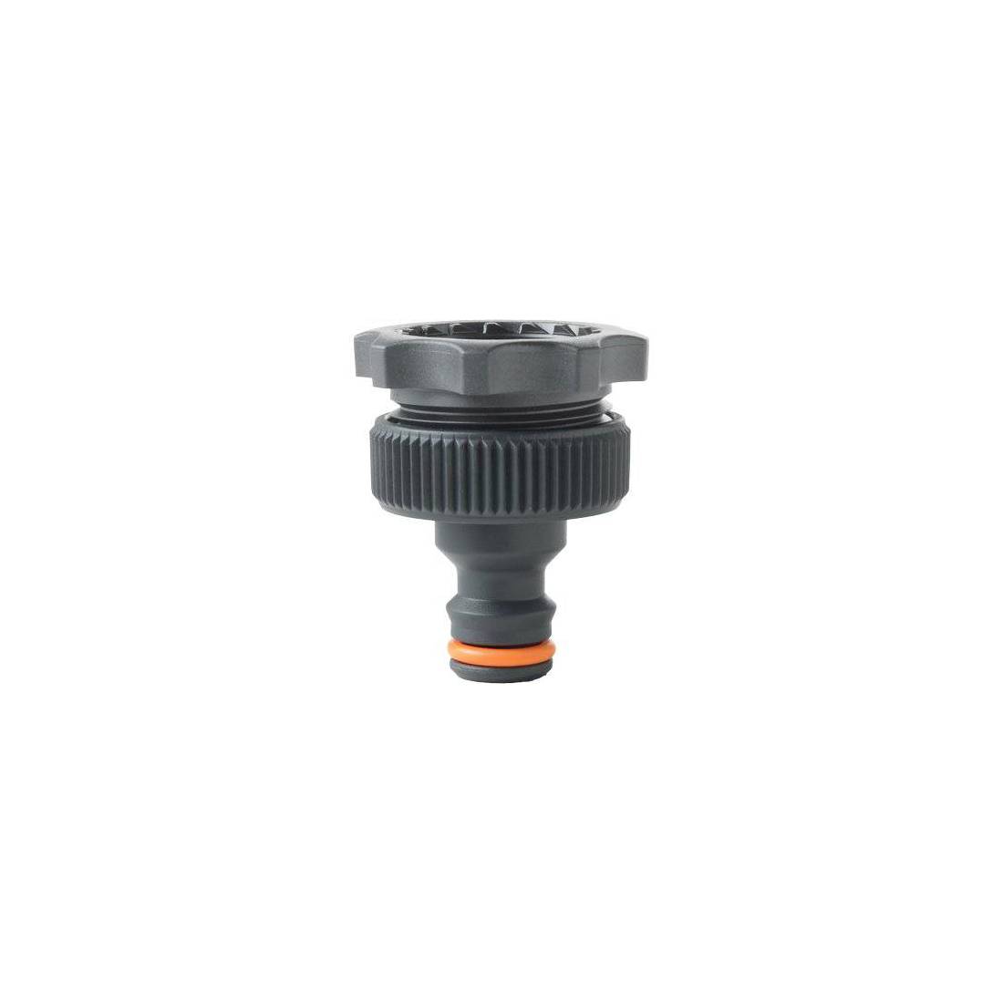 Filetage femelle à visser sur le robinet. Surface antidérapante. Raccord rapide au porte-tuyau.