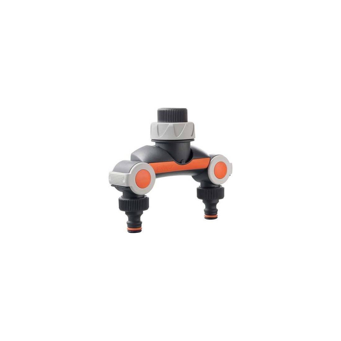 Raccord pour robinets à double sortie. Régulateur-modulateur de débit pour chaque sortie, pour régler le débit jusqu'à la fermeture totale. Raccord femelle pour robinet. Double raccord rapide au porte-tuyau.