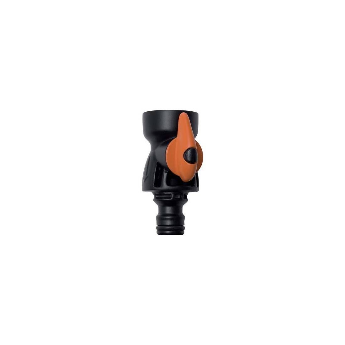 Robinet à bille avec régulateur de débit. Avec filetage femelle et raccord rapide au porte-tuyau.