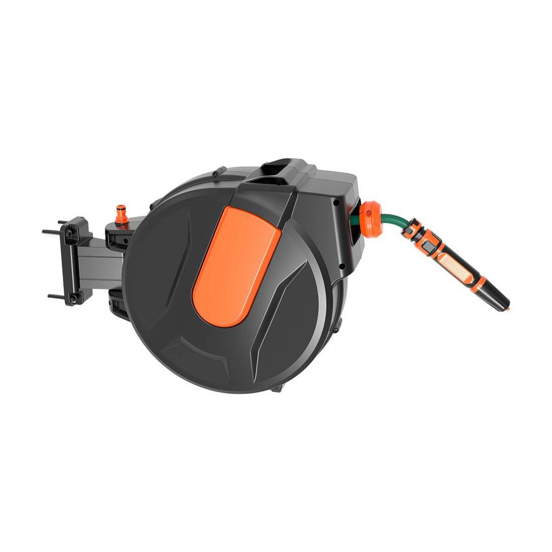 Con sistema di avvolgimento lento automatico con molla spiralata. Dotato di meccanismo che permette di bloccare il tubo a qualsiasi lunghezza. Installabile a parete sia in orizzontale che in verticale. Completo di tubo in pvc da Ø interno 12,5 mm (1/2'), pressione max 21 bar, supporto di fissaggio con viteria, staffa metallica. Rotazione sull'asse a 180°.