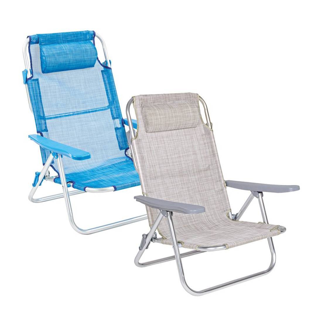 In alluminio, tubolari da Ø cm 2,2. Tessuto in textilene colorato. A 7 posizioni regolabili. Dimensioni: cm. 62x63xh.78.