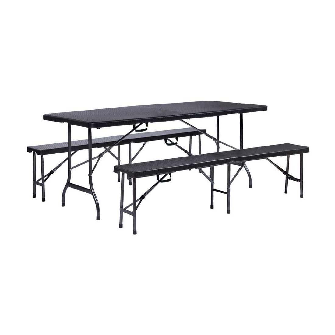 Ideale per giardini, gite fuori porta e per eventi ricettivi in genere. Struttura in metallo verniciato, effetto rattan. Piani di seduta ed appoggio in plastica HDPE. Composizione: 2 panche da cm. 180x25x42, 1 tavolo da cm. 180x75x74. Sistema di chiusura a valigetta.