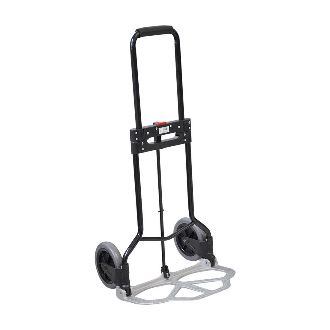 In metallo verniciato. Comodo e molto leggero, è dotato di manico telescopico, ripiegando su se stesso ruote e pala di carico. Una volta chiuso occupa pochissimo spazio. Indicato per lavori di sollevamento e trasporto medio impegnativi in magazzini, negozi e per uso hobbistico. Ruote piene Ø 175 mm, tubolare portante da Ø 17 mm, piano di carico in alluminio cm. 28x49, altezza a manico chiuso cm. 76, manico aperto cm 100.